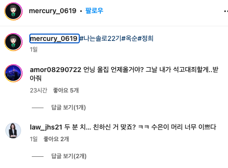 나는 솔로 22기 옥순 정희 싸웠을까? 신경전 : 옥순 정희 인스타